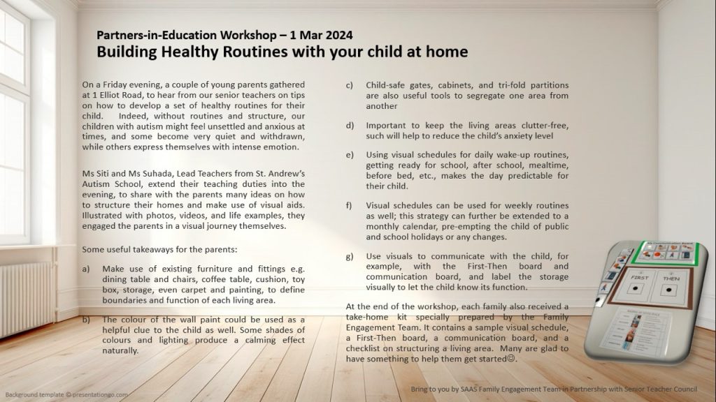 Besides organising regular monthly meetings and talks, the group actively spearheads projects to equip families with members with autism to lead meaningful lives and engage in mutually encouraging relationships with other families.